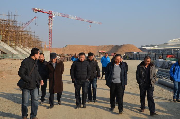 在長(cháng)途汽車(chē)站工地聽(tīng)負責人介紹情況。